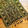 黒を背景に黄土色や黄色で幾何学模様が織り込まれ、温かな印象のイカットになっています。