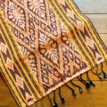 オレンジシャーベットのような柔らかなパステルカラーに薄い茶色やベージュ、黄色などで幾何学模様が織り込まれ、温かな雰囲気のイカットになっています。
