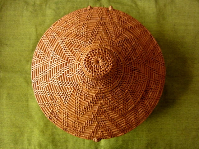 帽子のようなユニークな形の蓋(ふた)が付いたラウンド・バスケットです。
