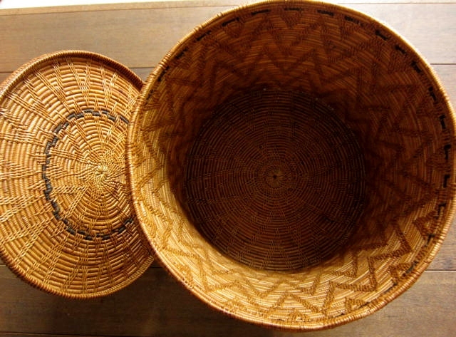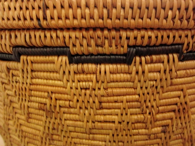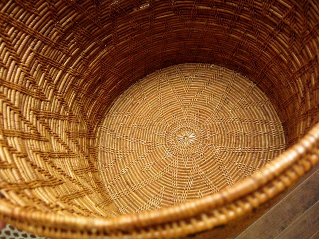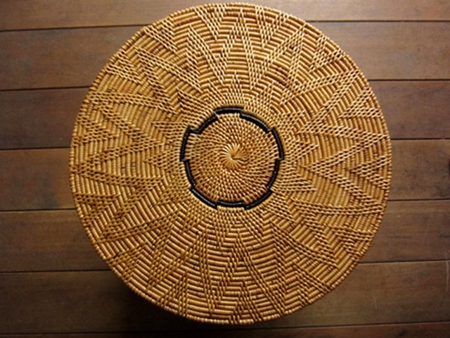 亜熱帯性のシダ科の植物「アタ」の茎を細く割いて細かく編み込み、天日干しとココナッツチップで燻す作業を何日も繰り返してようやく完成するアタ製品。