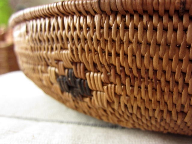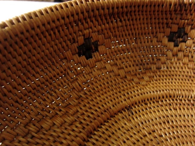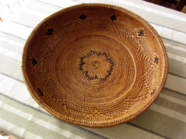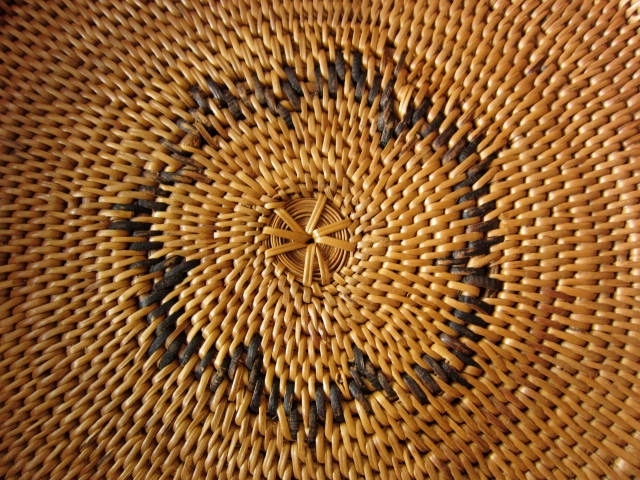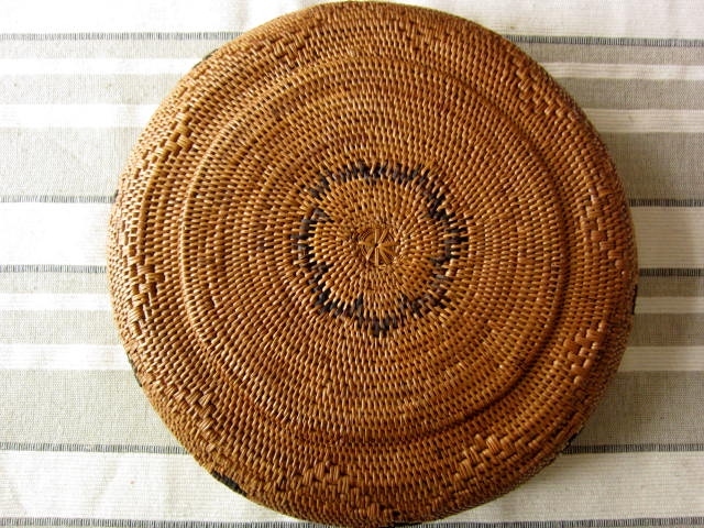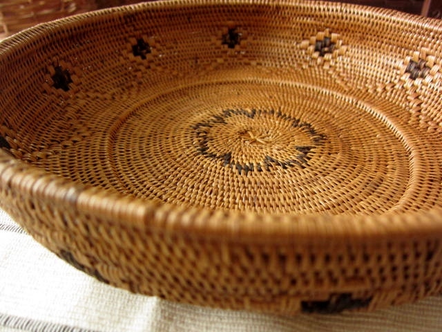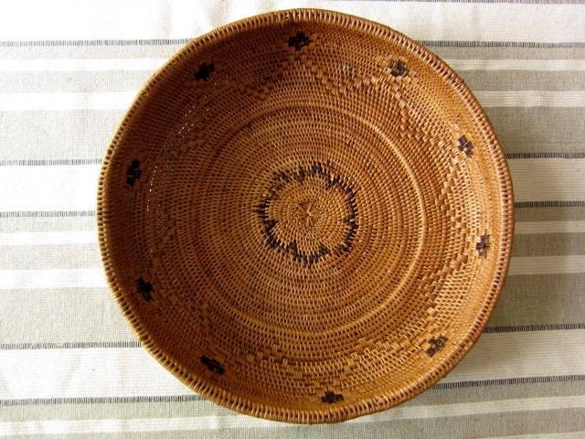 細かく揃った編み目が際立つアタ製平皿型バスケットです。