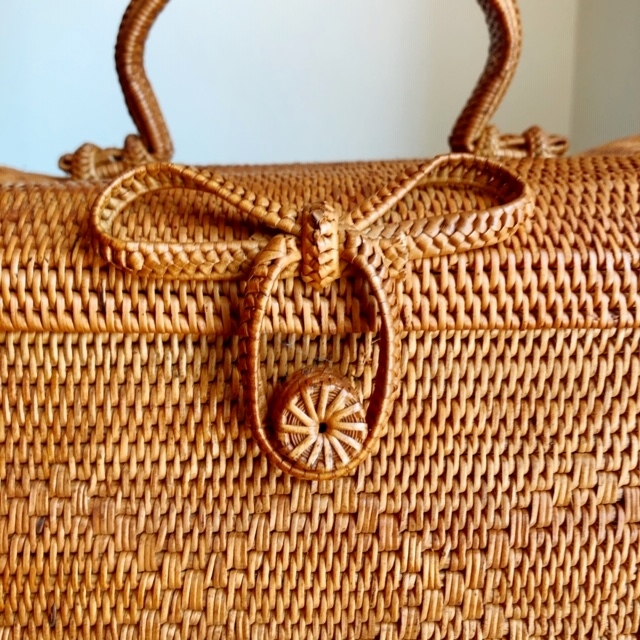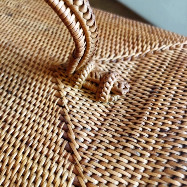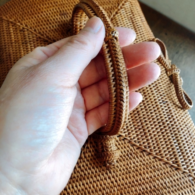 ボックスの側面の菱形模様や持ち手の部分も細く割かれたアタできっちりしっかり編まれています。