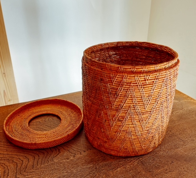 アタ製のふたの付いた筒型のくずかご兼収納ボックスです。