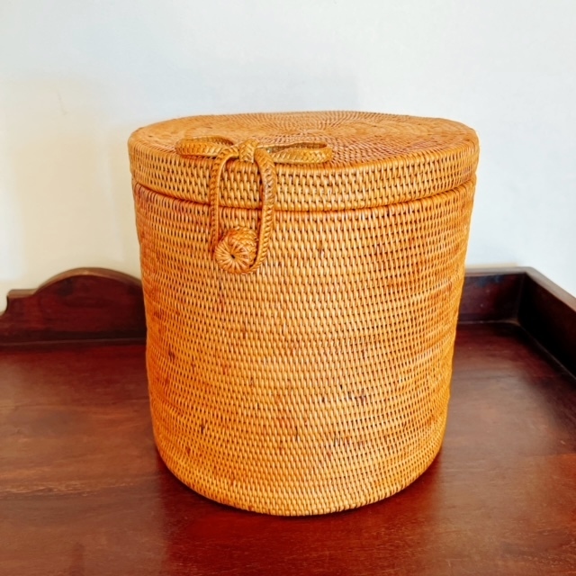 アタ製のふたの付いた筒型の収納ボックスです。