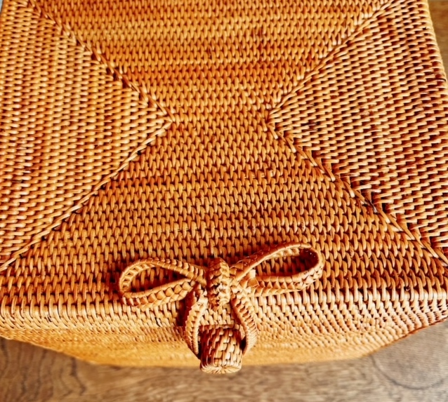 ふたを留めるアタ製のリボンもキュートなアクセントになっています。