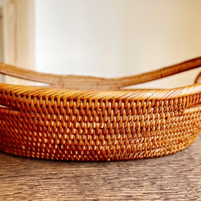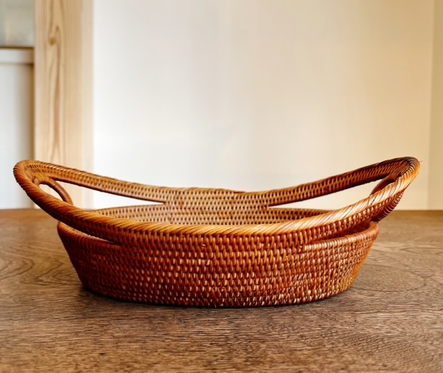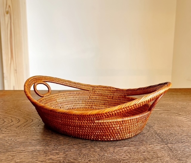 両側に可愛らしい丸い輪っかの「持ち手」の付いた楕円形型のアタバスケットです。