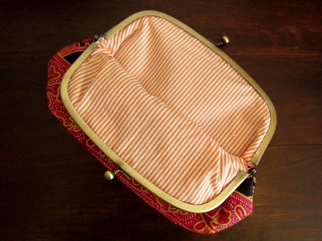 ポーチの内側は、明るいオレンジとホワイトのストライプがデザインされたコットンプリント。