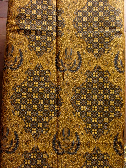 ソロ産バティックによく見られる「ソガ」という茶黄色がふんだんに使われて、落ち着いたなかにも豪華な雰囲気を感じさせる逸品に仕上がっています。