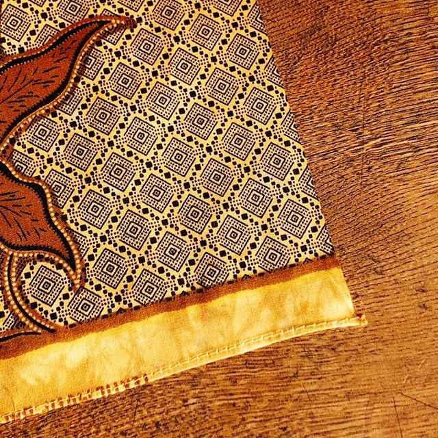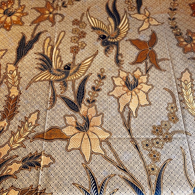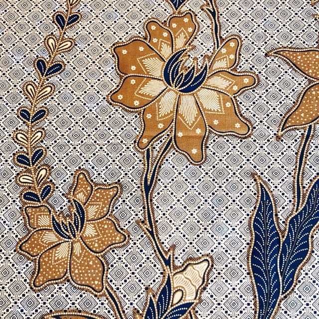 ソロ産バティックによく見られる「ソガ」という茶黄色がふんだんに使われて、落ち着いたなかにも豪華な雰囲気を感じさせる逸品に仕上がっています。