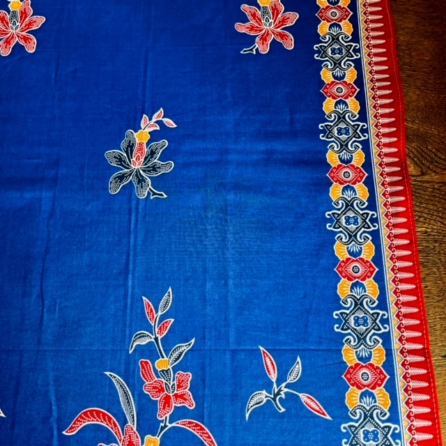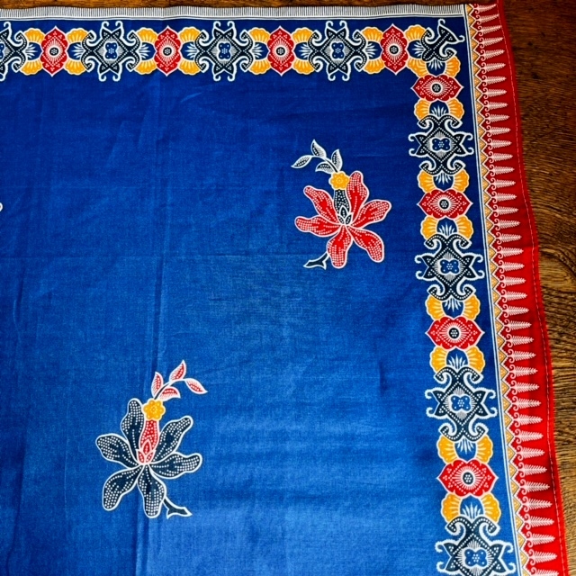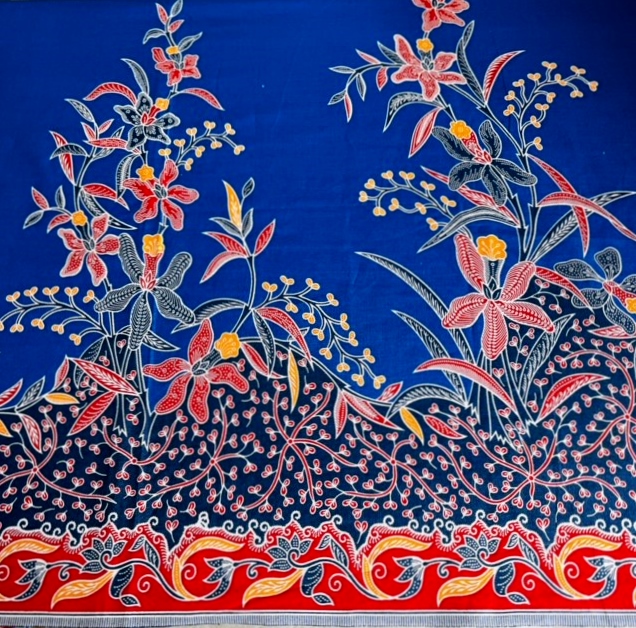 鮮やかなブルーを背景に、赤や白の花束がすっと伸びやかに描かれている、プカロンガン産らしい華やかな印象のバティックです。