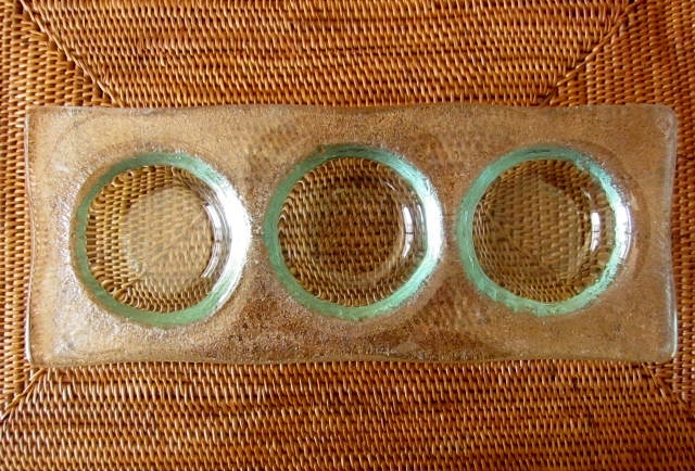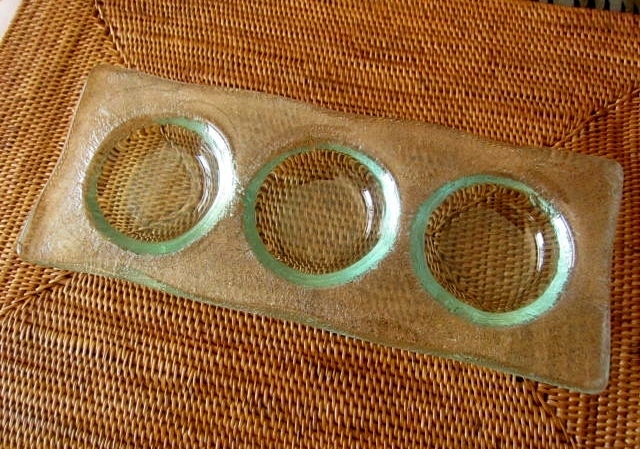 バリの海のような透明感と、光の具合によってグリーンにもブルーにも見えるクリアガラスのプレートは、おそうめんやお刺身などの薬味やお料理のソース、調味料などを載せたり、フルーツやオードブルなどを盛りつけたり、などいろいろアレンジされてお使いいただけます。