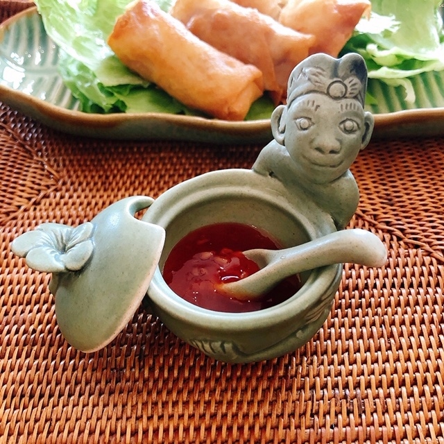 バリの男の子が壺を抱えているユニークなデザインのタバナン焼きのお砂糖入れ・調味料入れです。