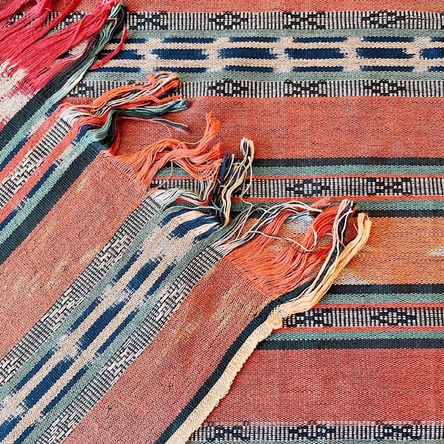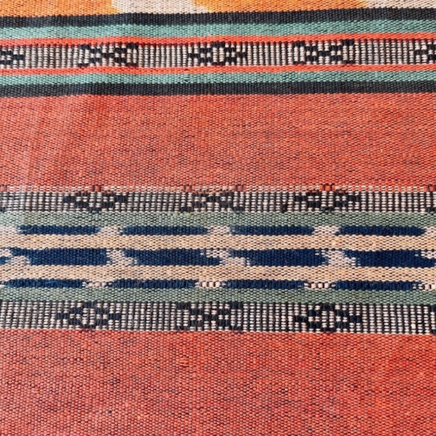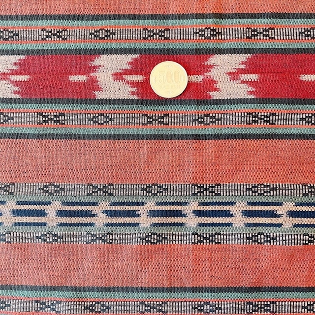 落ち着いた色味の茶色やオレンジ、ベージュ、緑、黒など多様な色糸が織り込まれていて、シックで上品な印象のイカットです。